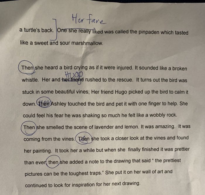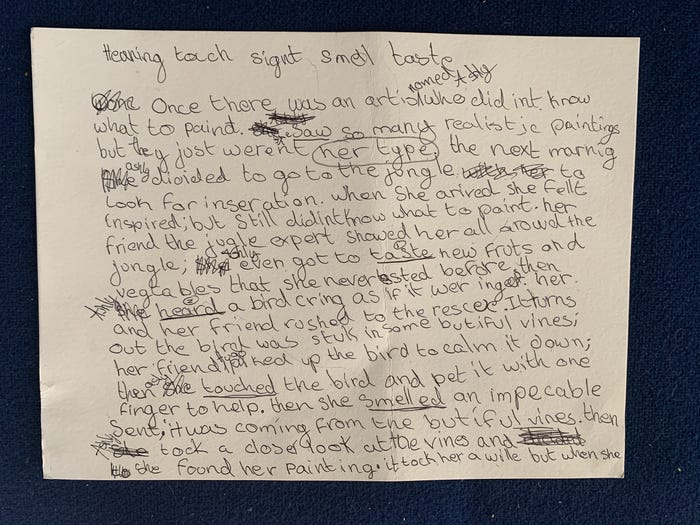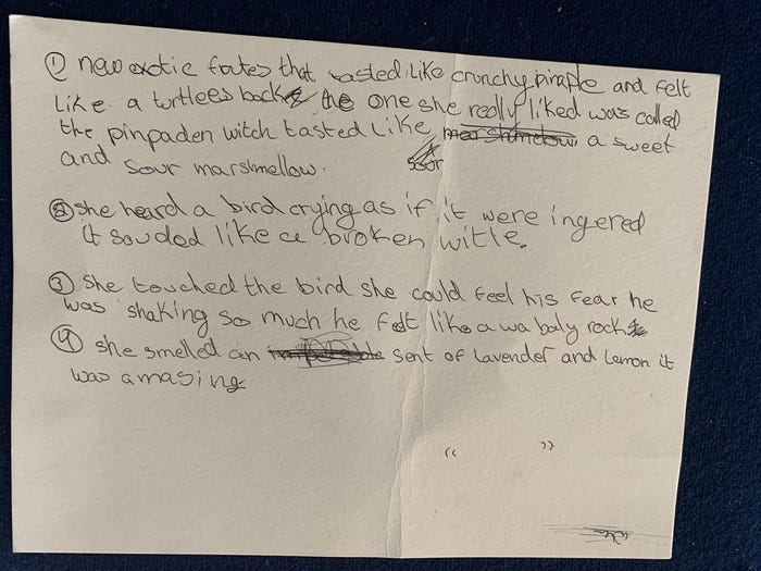 I had Bellamy list the senses at the top of her page then left her alone for 20 minutes. Everyone has a different attention span. Ideally, you would write until you have nothing left to say. Bellamy wanted to keep going and wrote for another 10. Before reading her writing, I had Bellamy underline and number where she used the five senses.