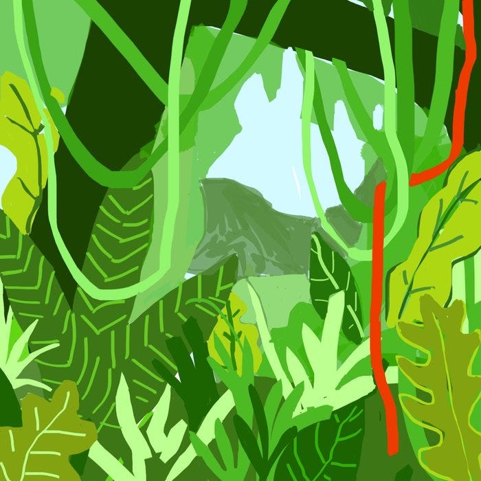 I emailed Becky Lewis knowing that she does quick, vibrant drawings on her phone. "Do you have something jungle-y? With lots of vines and a bit of red in it?" Thankfully, less than 24-hours later, Becky came through. You can see her drawing and read the story here.